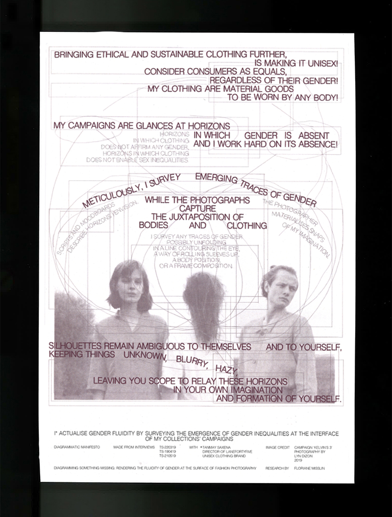 ☞ An article reflecting the the method of Diagrammatic Manifestos I developped in my MA dissertation in Visual Sociology. The method consists of editing manifestos with participants through a series of 2 to 3 interviews, expressing each of their unique approach to challenge fashion beyond womenswear and menswear.
